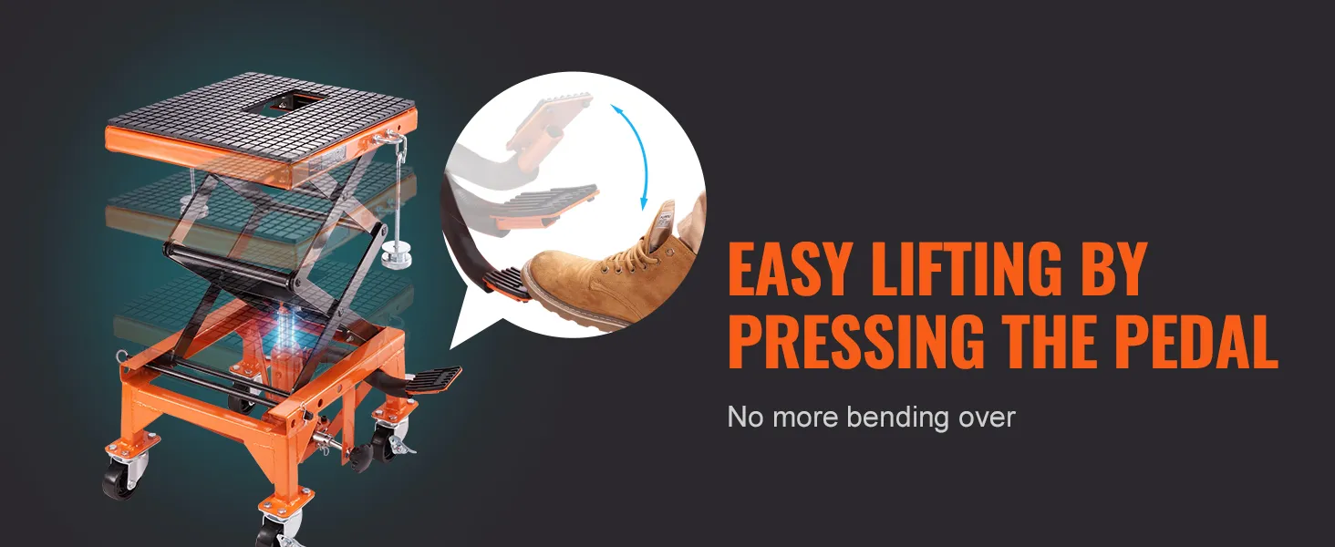 Features 2 universal wheels and 2 lockable wheels, allowing you to easily move it around. Once the motorcycle lift jack reaches the desired position, simply lock the wheels in place for stability during use.
