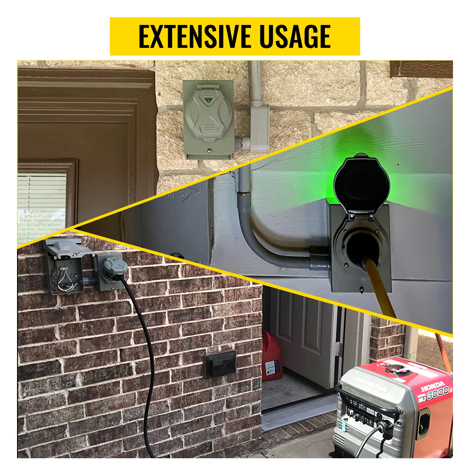 Las cajas de entrada del generador exterior mantienen los gases peligrosos de monóxido de carbono lejos de su casa cuando el generador está funcionando. Nuestra caja de entrada de energía del generador pasó las certificaciones de ETL. Monte la caja en el exterior y pase los cables a un interruptor o panel de transferencia. Luego, cuando se necesite energía de emergencia, conecte un cable de generador a la caja de entrada.