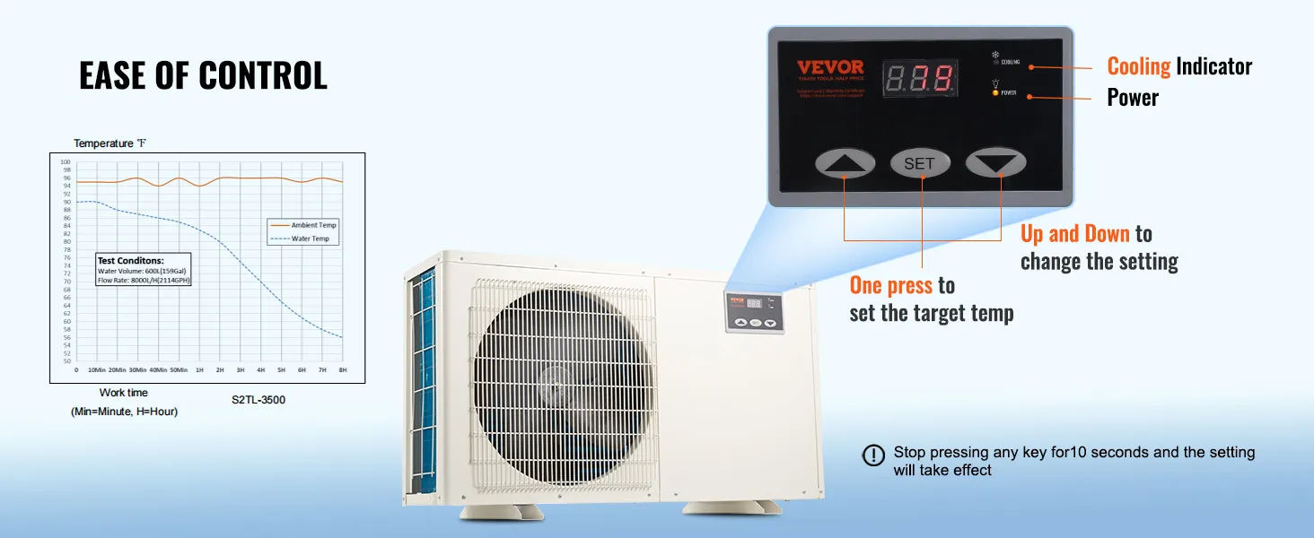 Además, el enfriador de agua VEVOR de 500 galones se destaca entre toneladas de enfriadores por su aplicación versátil, gracias a su potente compresor. Este enfriador funciona de manera eficiente y sin complicaciones con sistemas de agua dulce y de mar, lo cual es una tarea difícil para otros electrodomésticos de su rango de precios.