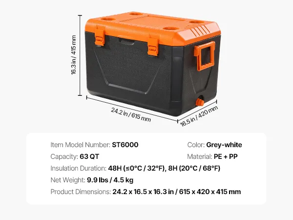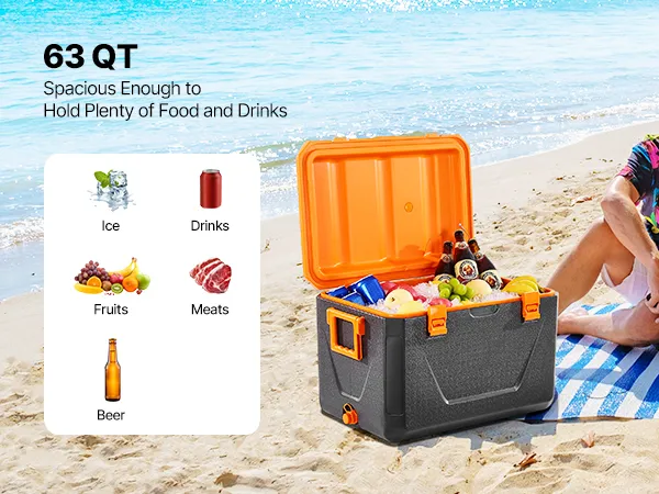 Este enfriador proporciona 63 cuartos de galón (aproximadamente 60 litros) de espacio de almacenamiento, lo que proporciona amplio espacio para una gran cantidad de alimentos y bebidas.
