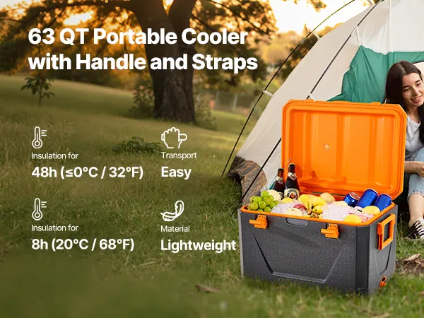 Gran capacidad de 63 QT: este enfriador portátil ofrece una capacidad de 63 QT y puede contener hasta 90 latas (330 ml/11 oz), ideal para viajes largos, picnics familiares y más.