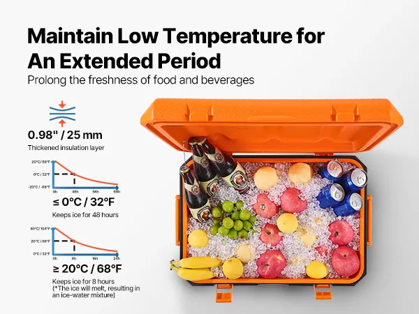 Refrigeración duradera: con una capa de aislamiento de 25 mm de espesor, conserva el hielo hasta 48 horas a temperaturas ≤ 0 ℃ / 32 ℉ y hasta 8 horas a temperaturas ≥ 20 ℃ / 68 ℉ (el hielo se derretirá y se convertirá en agua helada). Consejo: para obtener resultados óptimos, evite la luz solar directa y use al menos un 40 % de hielo en relación con el volumen total.