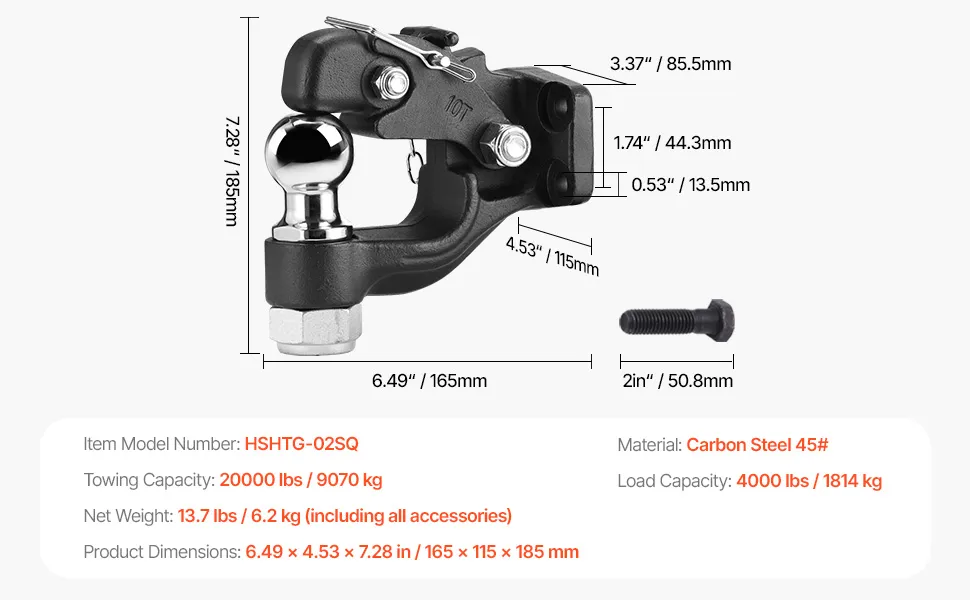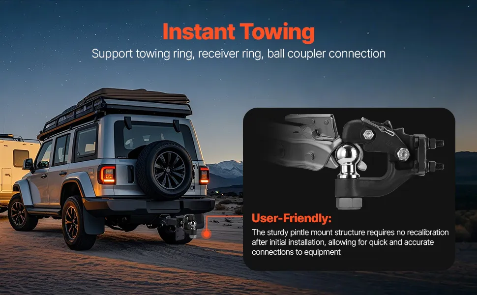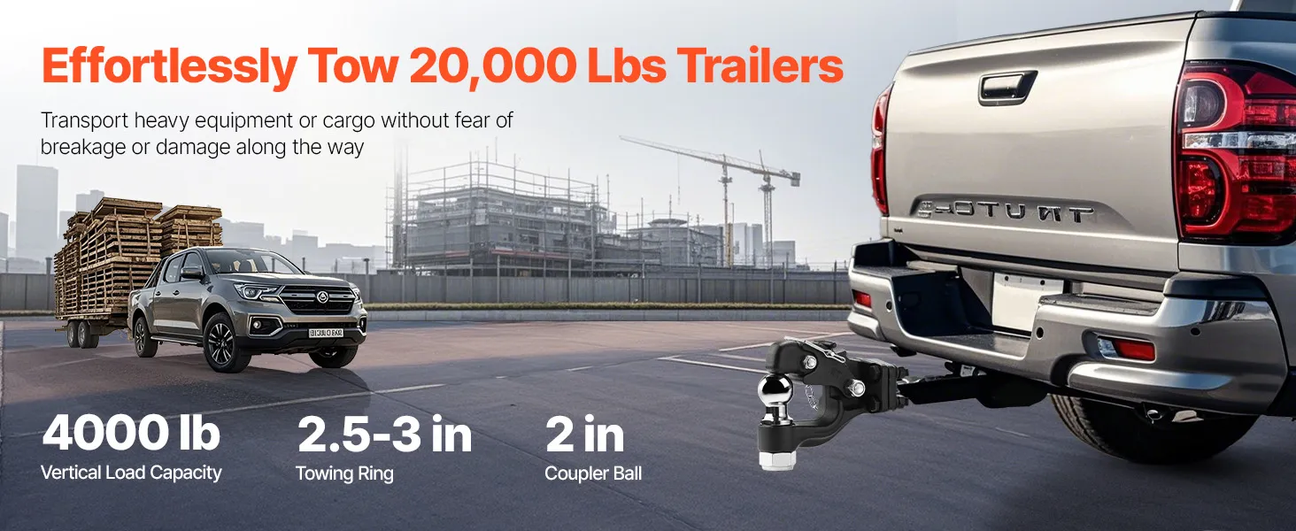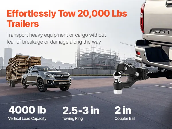 Alta capacidad de carga: nuestro enganche de pivote soporta cargas de remolque de hasta 20 000 libras, con una capacidad de carga vertical de 4000 libras. Tiene un tamaño de bola de enganche de 2" y se puede conectar a anillos de luneta de 2,5" a 3", lo que facilita el transporte de equipos y cargas pesadas.