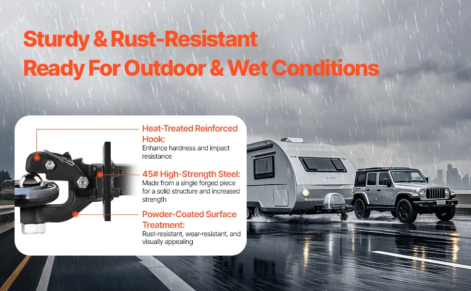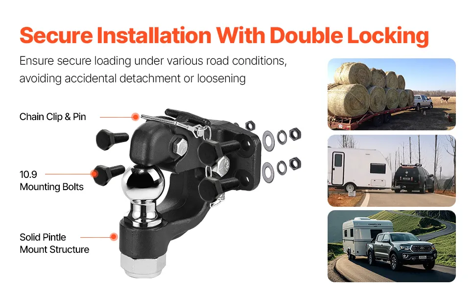 Conexión segura: diseñado con una sólida estructura de montaje de una sola pieza y pernos de montaje GB10.9, el enganche de gancho de pivote proporciona una conexión estable y de alta resistencia, lo que reduce los riesgos de seguridad. Esto es especialmente beneficioso para viajar en condiciones climáticas adversas o con baches.