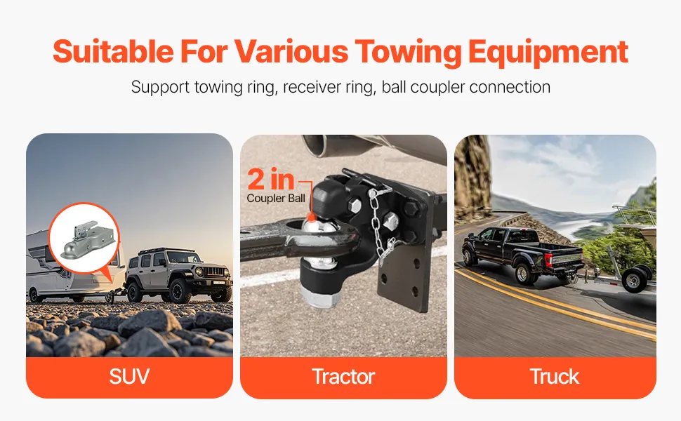 Amplia compatibilidad: con un diseño de tamaño estandarizado, nuestros enganches de remolque con gancho de pivote se adaptan fácilmente cuando se usan con anillos de luneta, anillos receptores y acopladores de bola, lo que los hace compatibles con varios equipos de remolque, incluidos camiones, tractores, SUV y vehículos todo terreno.