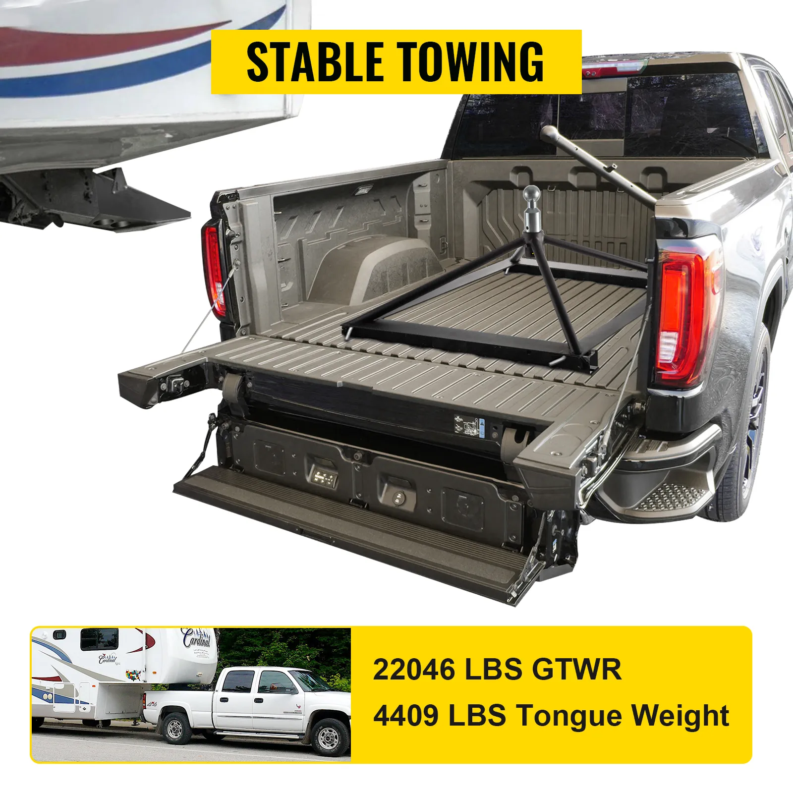 Puede ajustar rápidamente la altura del enganche de la quinta rueda según sus necesidades (posición inferior de 15,73", posición media de 16,91" y posición superior de 18,09").