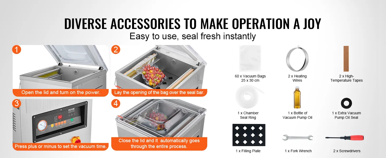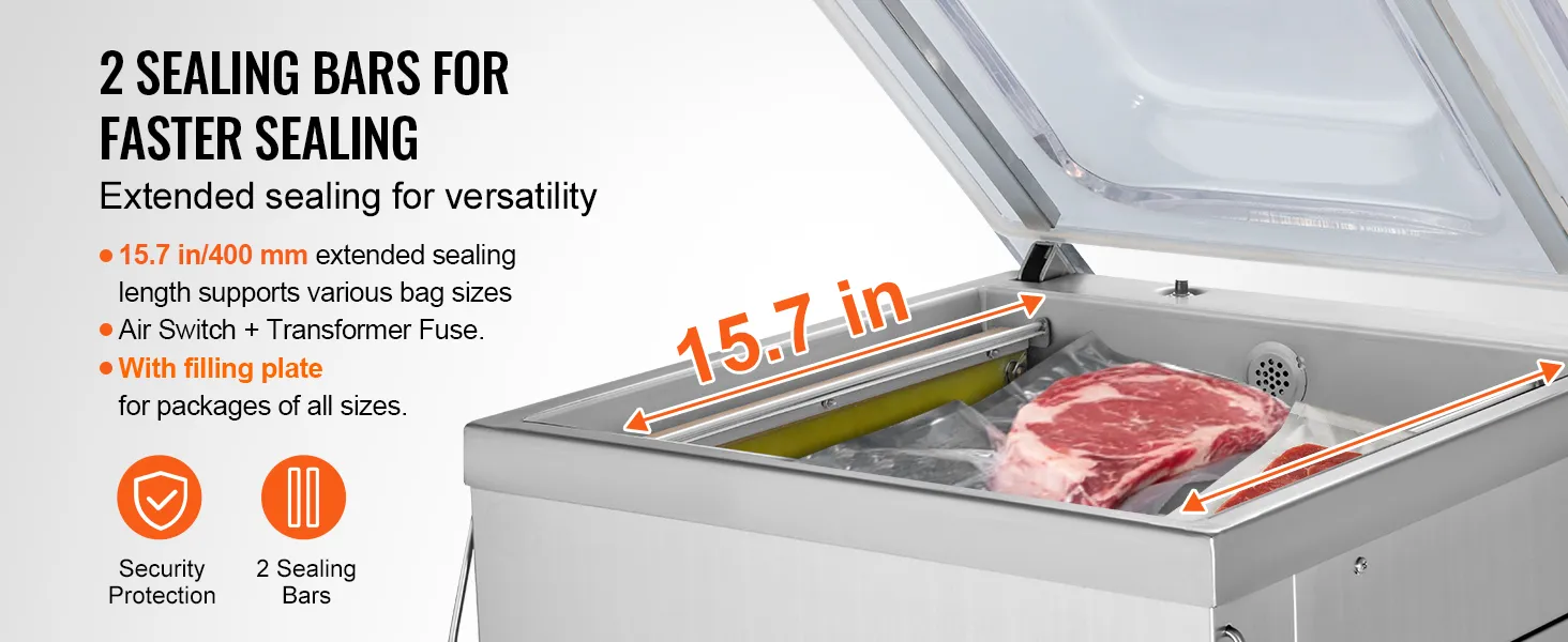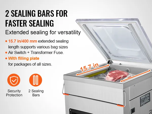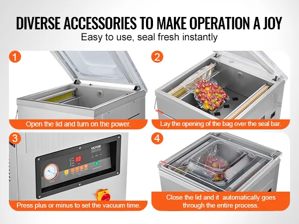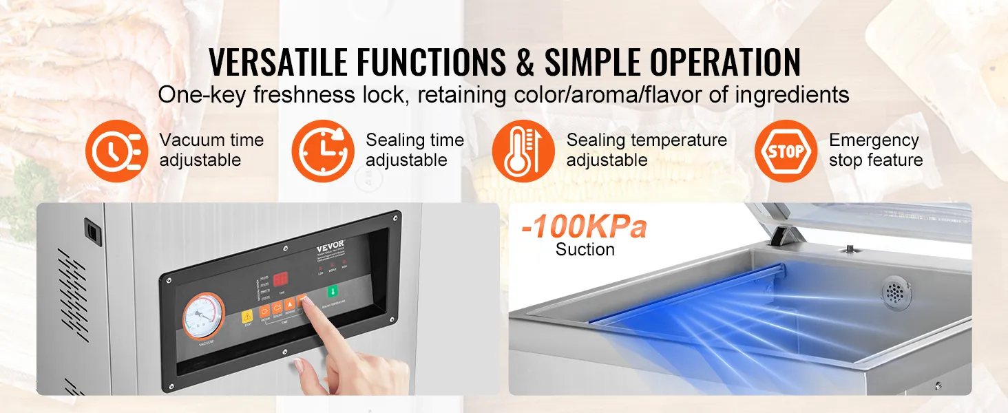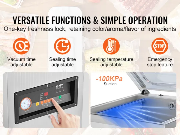 Un sellador al vacío fácil de usar ahorra mucho tiempo. Puede sellar rápidamente sus alimentos sin la molestia de instrucciones o configuraciones complejas. De esta manera, podrá realizar sus tareas de sellado de manera eficiente. En este caso, la envasadora al vacío extra profunda VEVOR es muy fácil de usar. Todo lo que necesita hacer es configurar la temperatura y la longitud del sellado usando los botones que se encuentran en la computadora de microcontrol y este sellador estará listo para funcionar. Por lo tanto, utilice este sellador al vacío automático si desea sellar sus bolsas cómodamente.