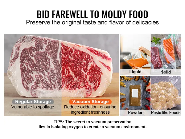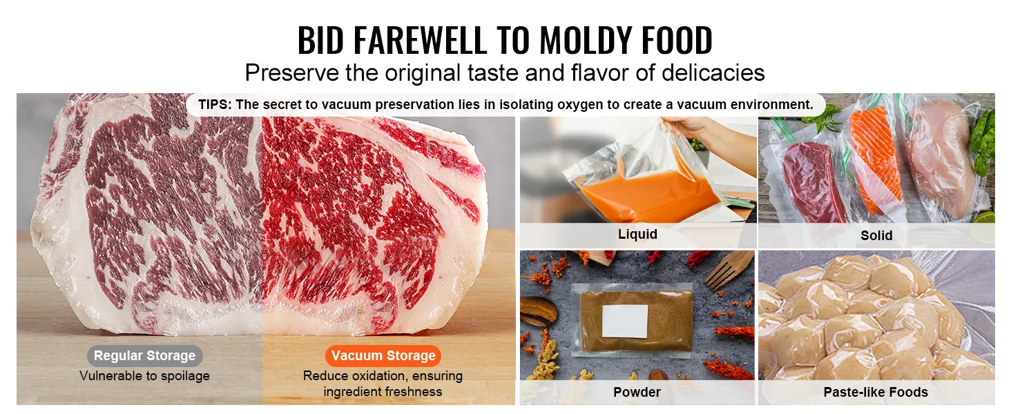 Si se pregunta qué tipos de alimentos puede conservar con este sellador, la respuesta simple es que este sellador es perfecto para todo tipo de alimentos. Ya sean verduras, frutas, carne, pollo, productos electrónicos o cereales, no dude en utilizar esta aspiradora comercial y prolongue la vida útil de sus alimentos.