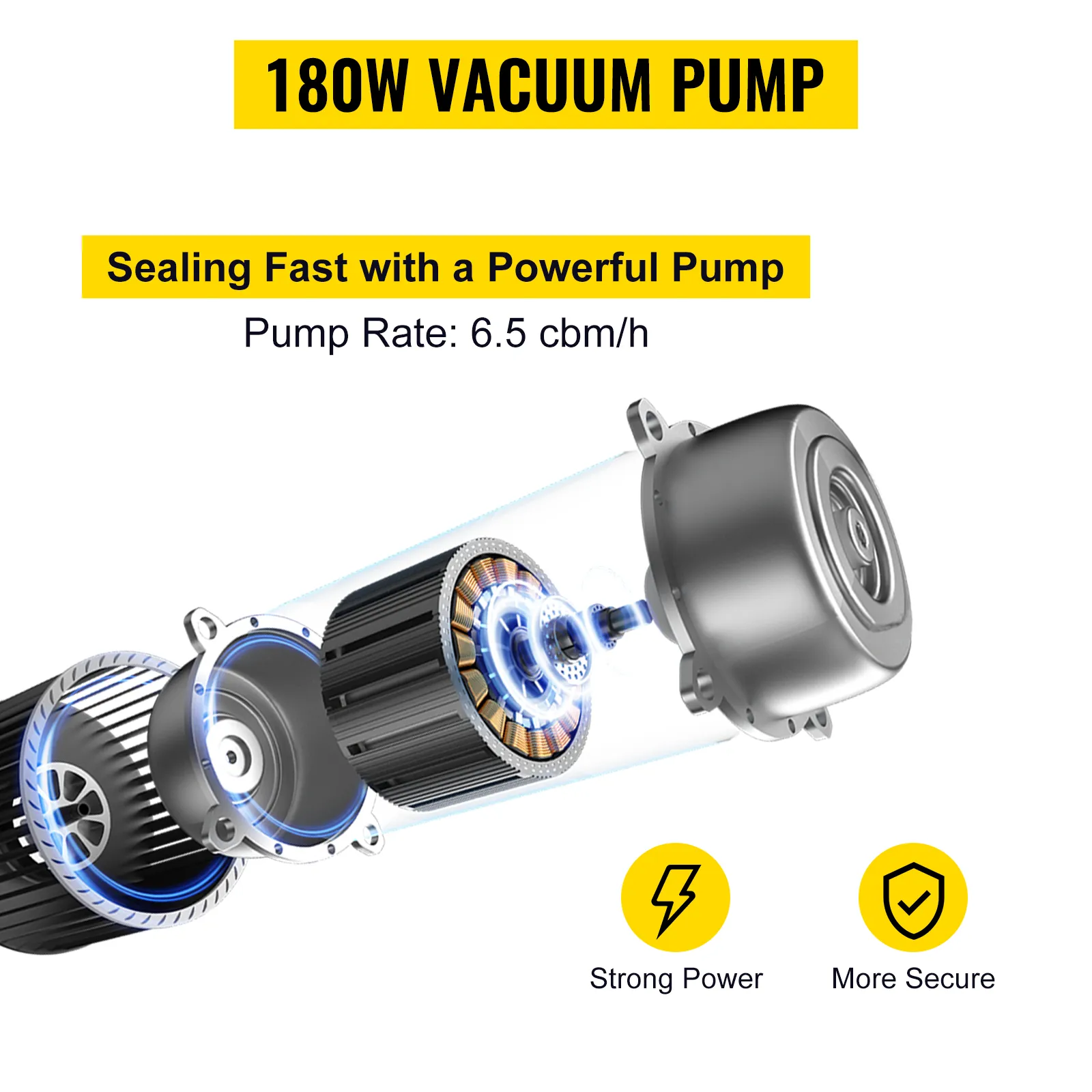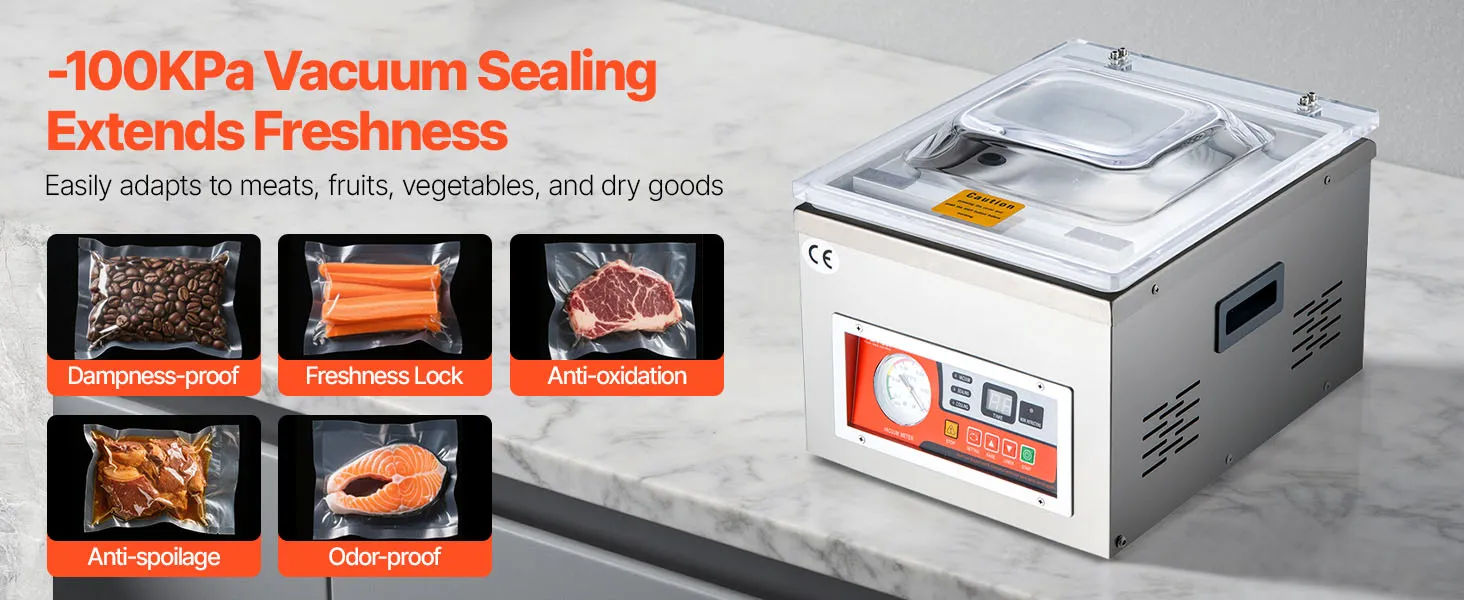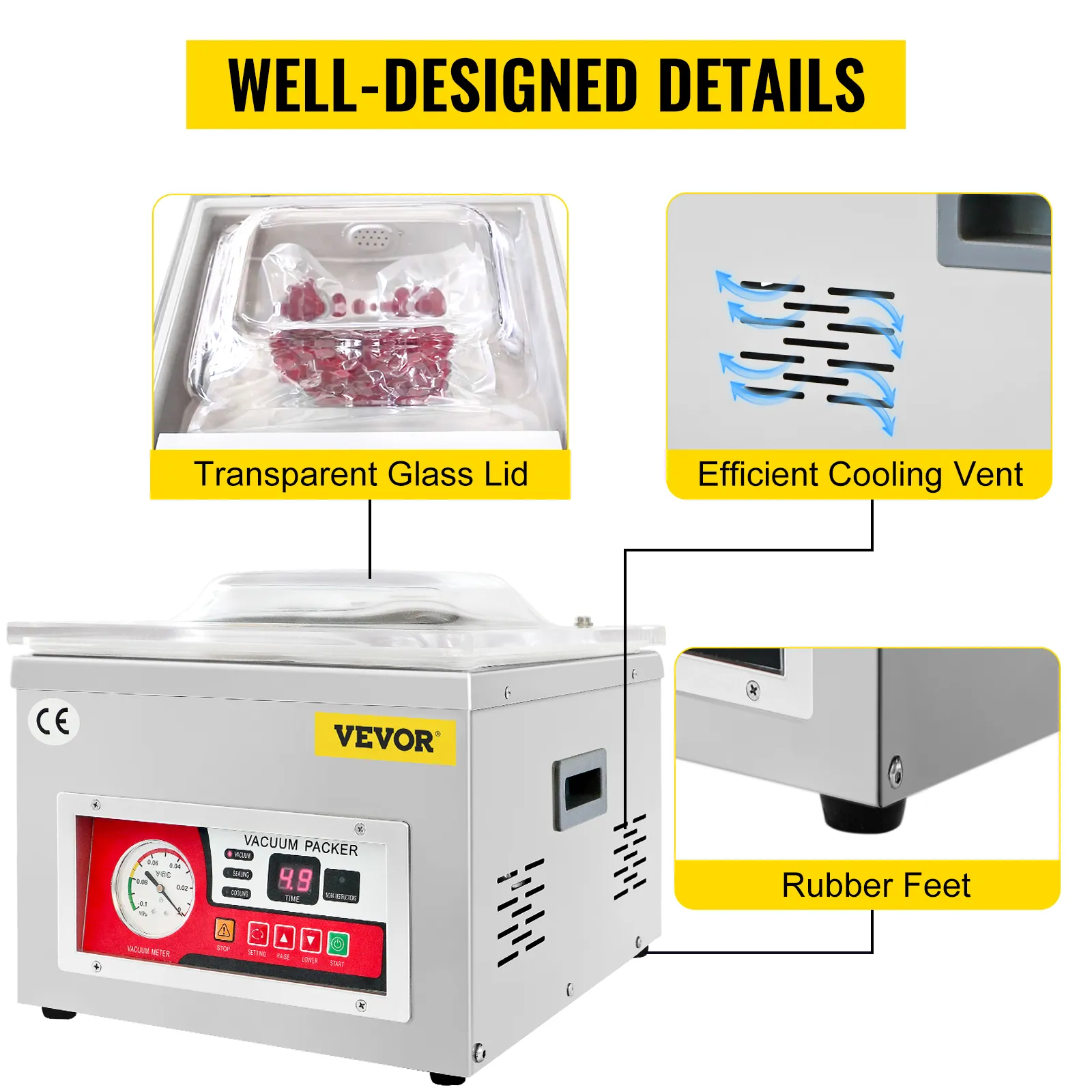 El sellador al vacío de cámara VEVOR está fabricado con material de alta calidad. El acero inoxidable del marco externo resiste la corrosión o el desgaste. Se encuentran presentes una bomba de vacío internamente fuerte, una barra de sellado confiable y puertas de cámara resistentes.