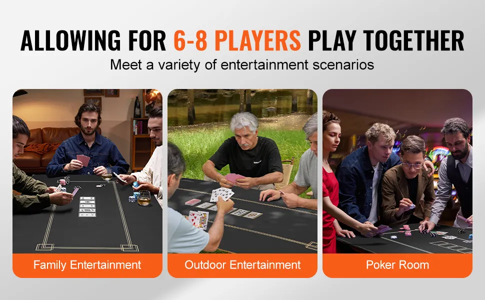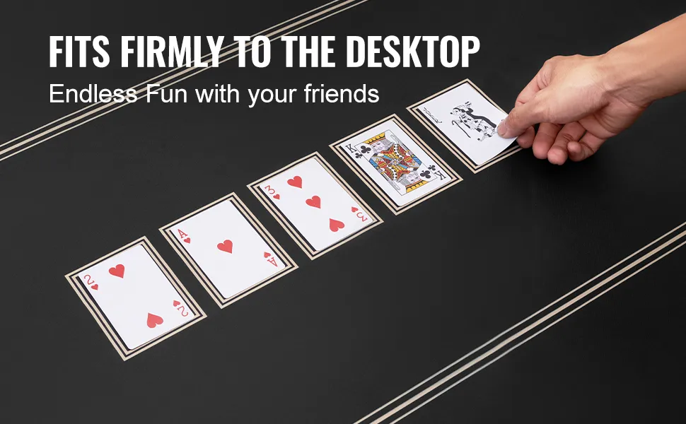 De 6 a 8 jugadores juegan juntos: 70" x 35" / 180 x 90 cm. Este gran diseño de póquer transforma instantáneamente cualquier mesa en una mesa de juego de póquer profesional. Su amplio tamaño da cabida a varios jugadores, lo que lo hace adecuado para diversos entornos, como el hogar, el exterior y la sala de póquer, lo que le permite sumergirse en una diversión competitiva sin fin.