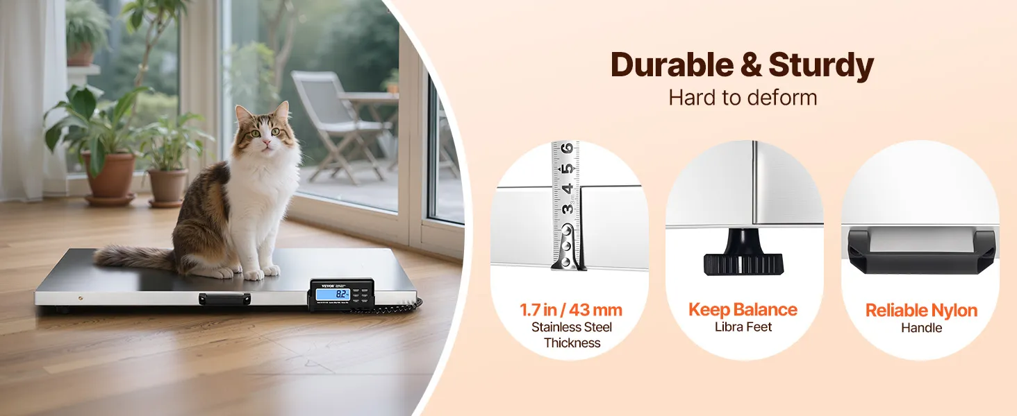 BÁSCULA PARA MASCOTAS CON CAPACIDAD DE 880 LB: Esta báscula digital multiusos y de alta resistencia pesa artículos pequeños y grandes. Capacidad máxima de pesaje de 880 LB.