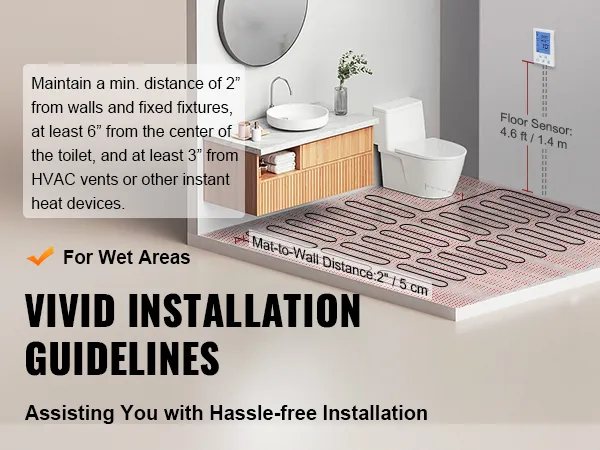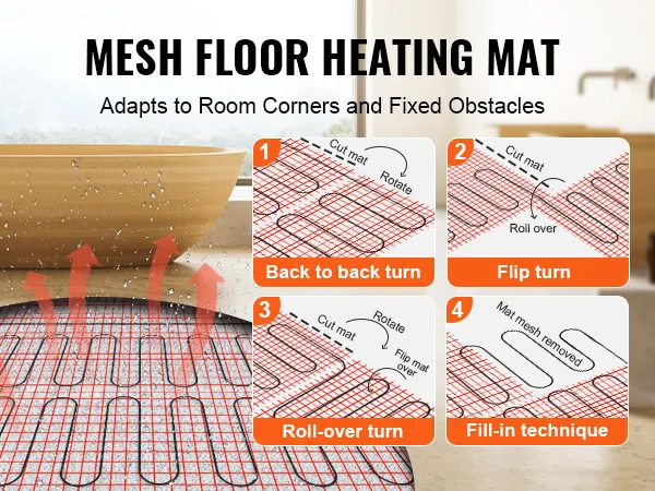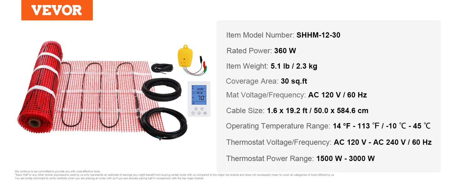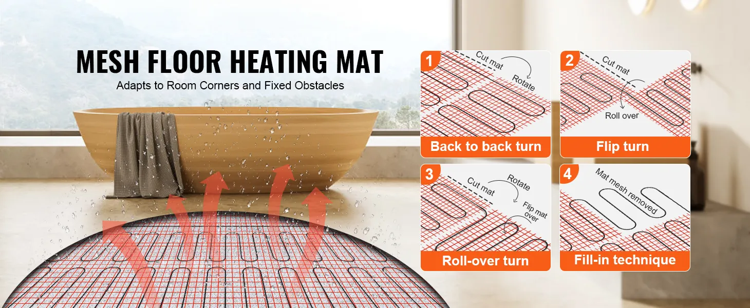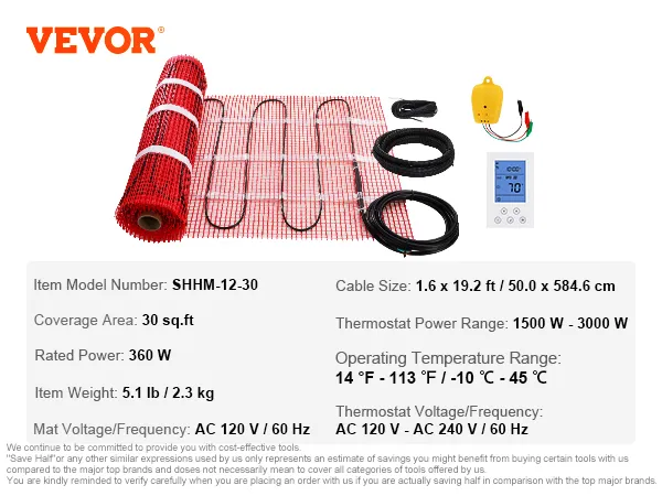 Nuestro tapete de calefacción de piso eléctrico VEVOR incluye un termostato programable de 4 eventos/7 días con protección GFCI requerida por código. Los tapetes Heatwave Floor Heating se pueden colocar de muchas maneras y son reversibles para acomodar áreas de varias formas.