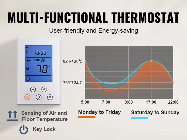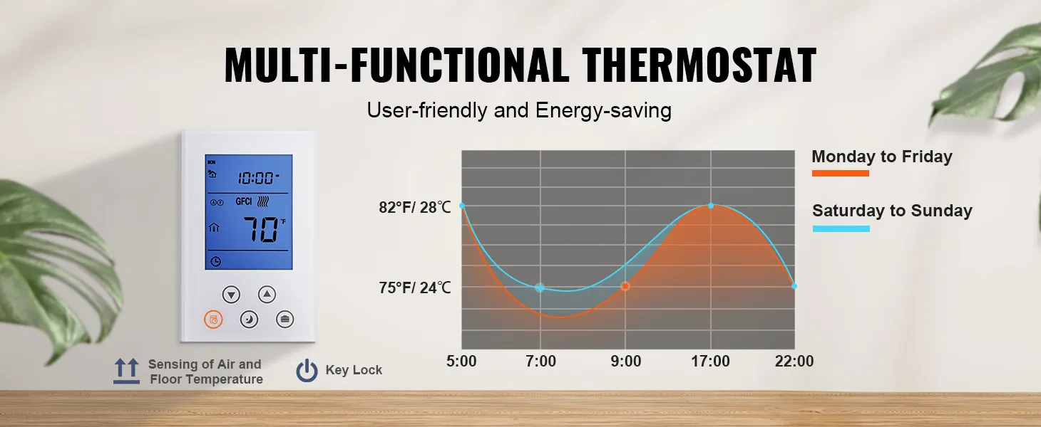 Termostato programable: el termostato con pantalla táctil es fácil de usar. El termostato tiene un GFCI (interruptor de circuito de falla a tierra) incorporado para protección. Las características incluyen detección dual (aire/piso), registro de energía y bloqueo para niños. Ofrece cuatro modos de control de temperatura, incluida una función de programación de 7 días que elimina la repetición.