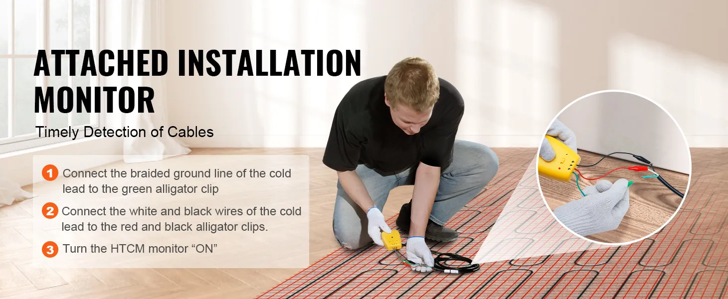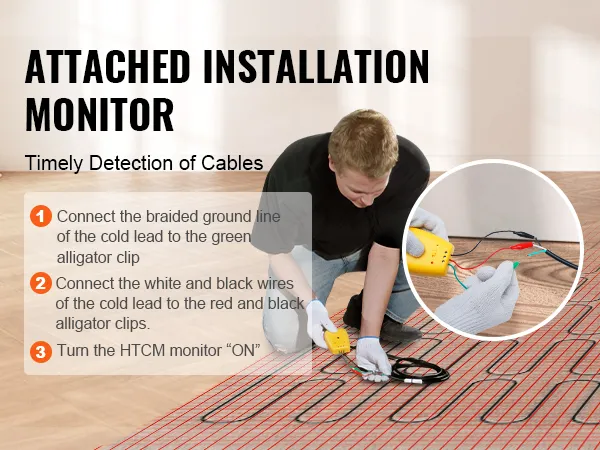 Inspección oportuna de cables: el monitor de instalación en el kit elimina la necesidad de compras adicionales. Asegurando el correcto funcionamiento del cable de calefacción por suelo radiante, evitando la necesidad de mover y volver a verter hormigón bajo el suelo. Al seleccionar el tamaño, redondee su espacio de piso. Por ejemplo, un piso de 2,6 metros cuadrados requiere una alfombra de 2 metros cuadrados para evitar el exceso de cobertura.
