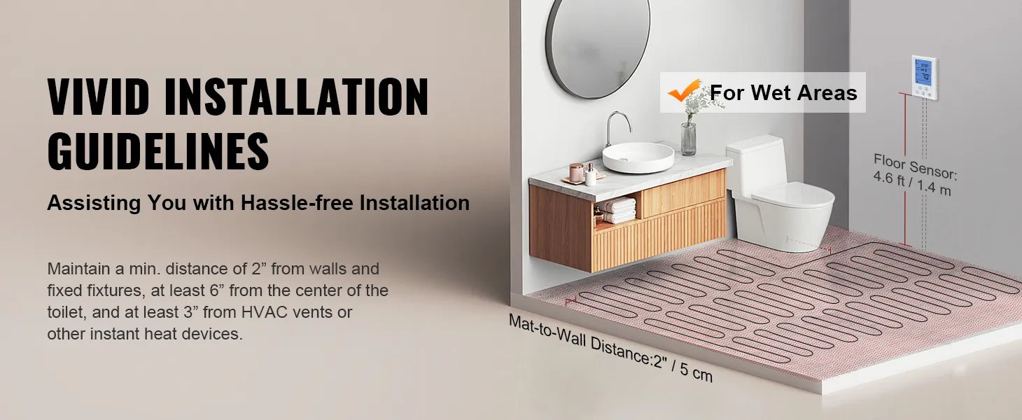 Guía de instalación completa: el sistema de calefacción por suelo radiante proporciona una guía detallada de instalación y uso en el manual de instrucciones. Le ayuda a elegir el tamaño correcto y proporciona orientación para la instalación y el uso. La estera calefactora se puede instalar debajo de baldosas de cerámica, piedra natural, laminado o pisos de madera.