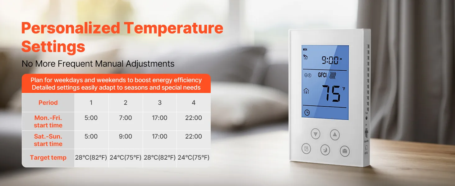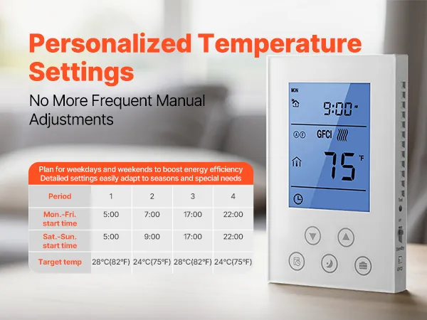 Función de programación de 7 días: Este termostato programable permite una programación flexible de la temperatura, lo que reduce la necesidad de ajustes manuales. Configure diferentes temperaturas para distintos periodos de tiempo para minimizar el desperdicio de energía.