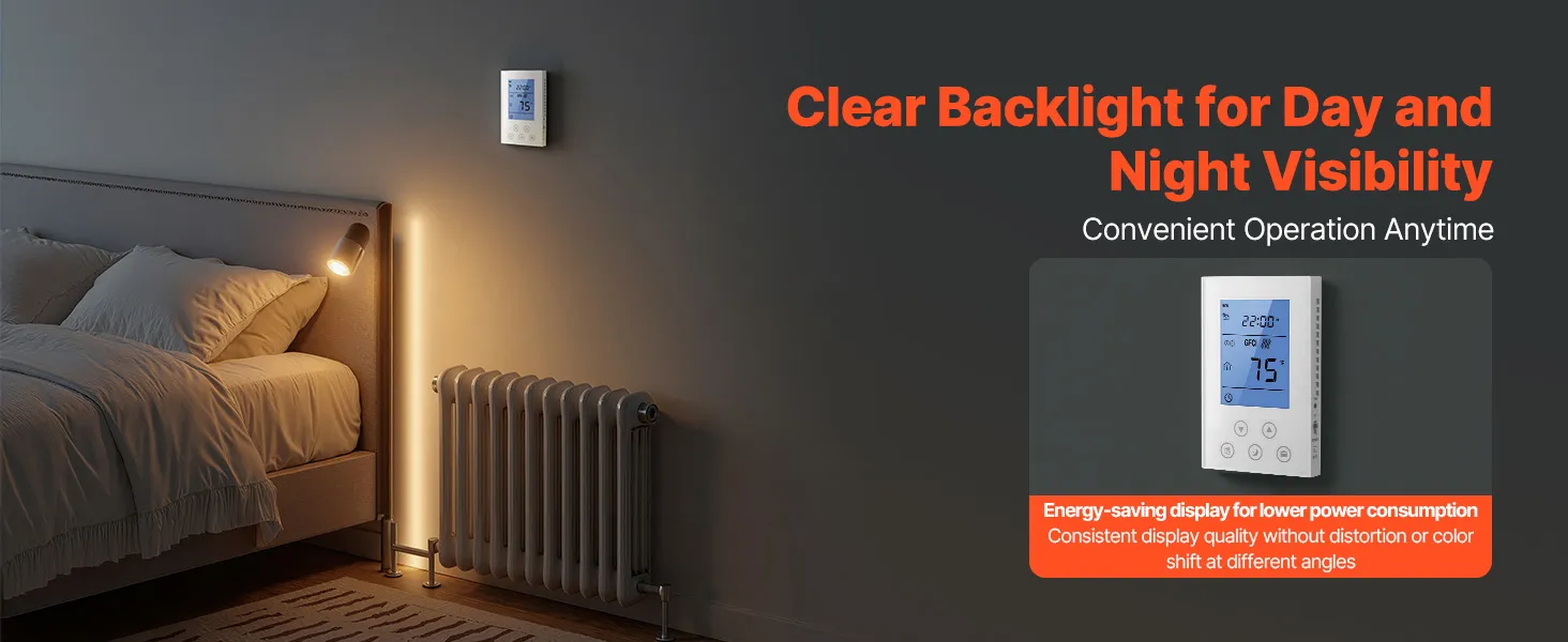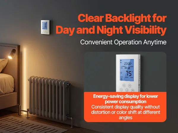 Pantalla grande y fácil de leer, visible incluso con mucha luz, adaptable a condiciones de poca luz. La interfaz intuitiva muestra la temperatura y los detalles de programación, lo que permite ajustes sencillos para una máxima comodidad.