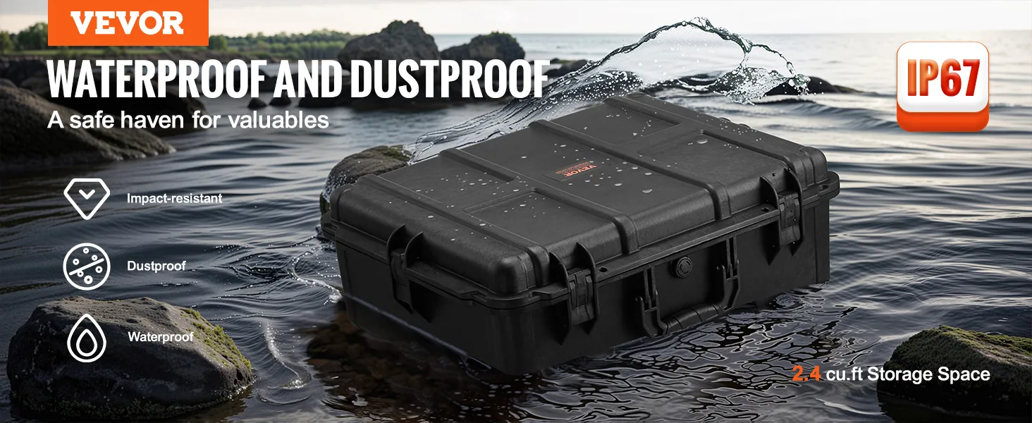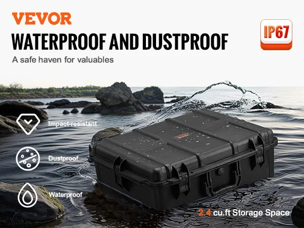 Informe de prueba IPX67: el estuche rígido impermeable Vevor ha pasado el informe de prueba internacional IPX67. Los sellos de junta tórica y el diseño de la válvula de ecualización de presión automática garantizan que sus artículos se mantengan seguros incluso en el agua, lo que le permite disfrutar de las actividades acuáticas sin preocupaciones.