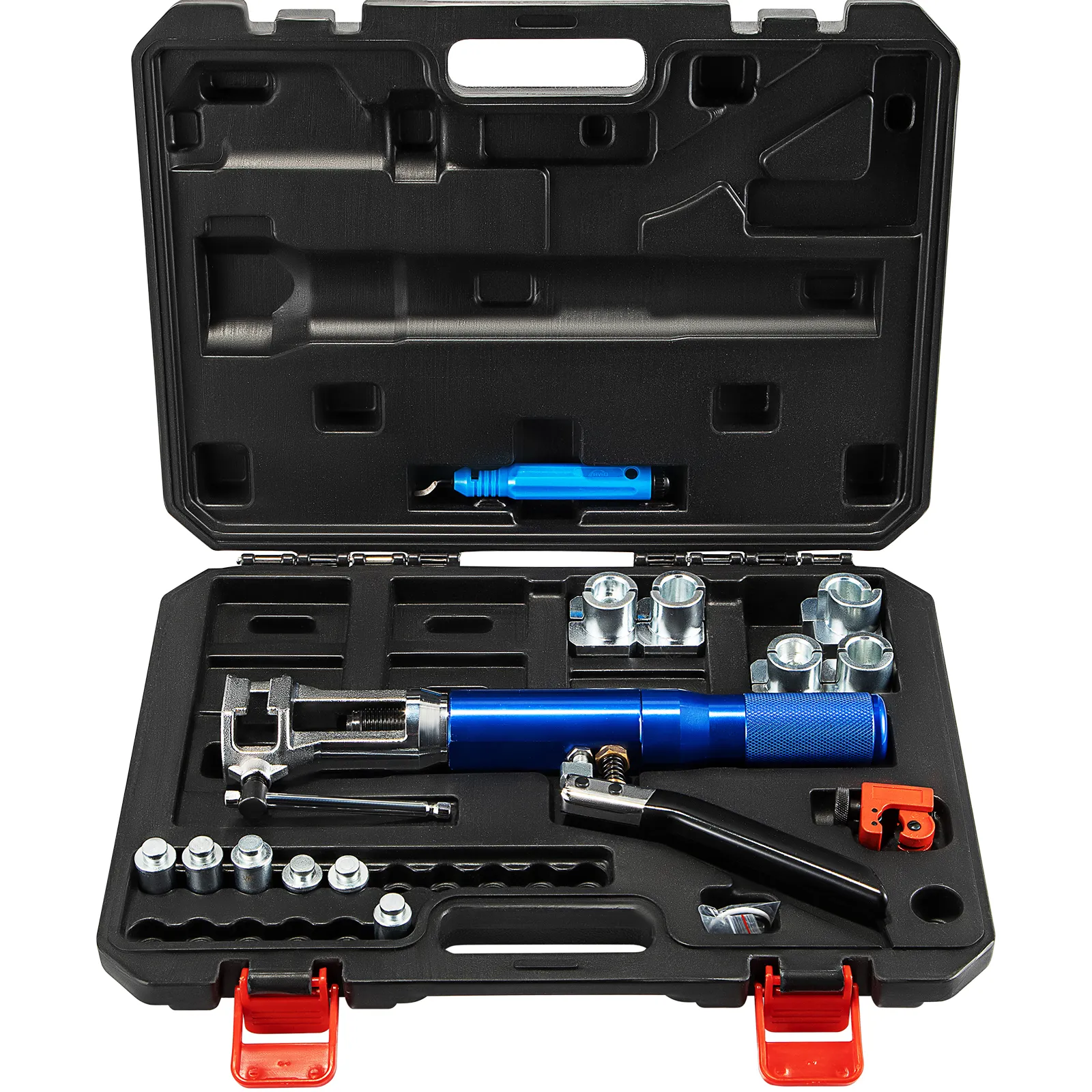 Este kit de herramientas de abocardado hidráulico es compacto y fácil de almacenar con una caja de herramientas de plástico duradero. Ahorra espacio y hace que el kit de abocardado sea fácil de transportar.