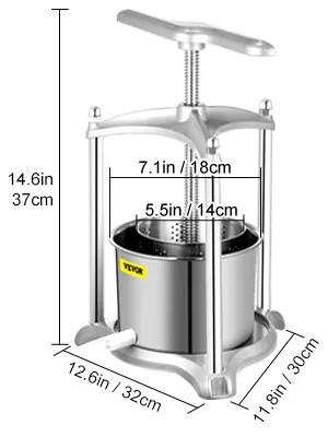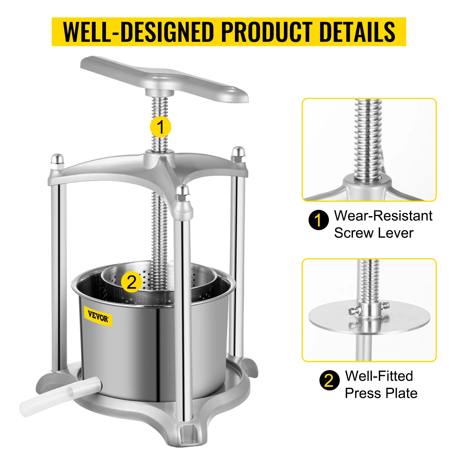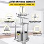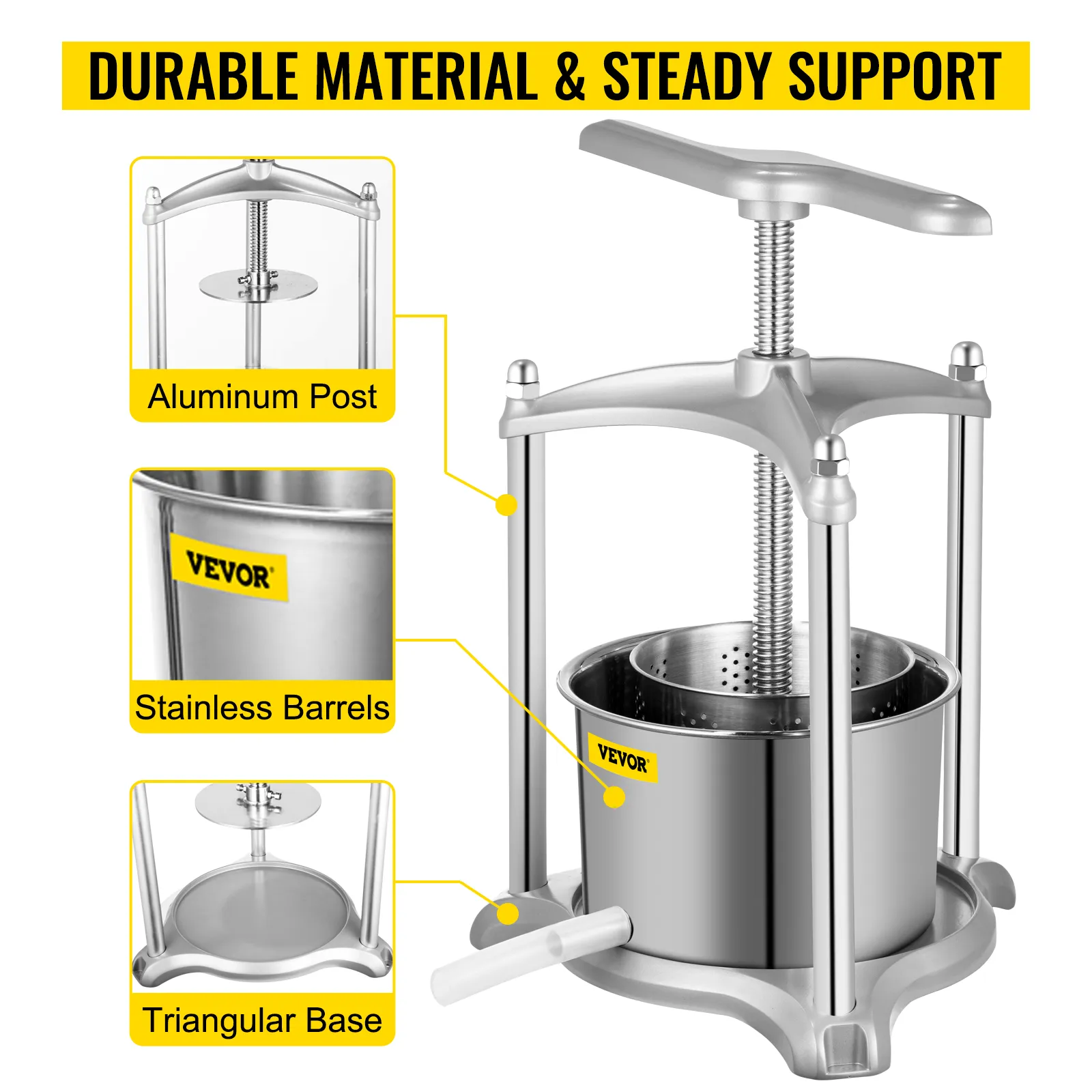 Hecho de acero inoxidable y aluminio duraderos, esta prensa manual para vino de frutas seguramente puede soportar un uso prolongado. La estructura triangular y la base engrosada proporcionan un soporte estable. Todas las partes que entran en contacto con los ingredientes alimentarios, como 2 barriles y la placa de presión, adoptan material apto para uso alimentario.