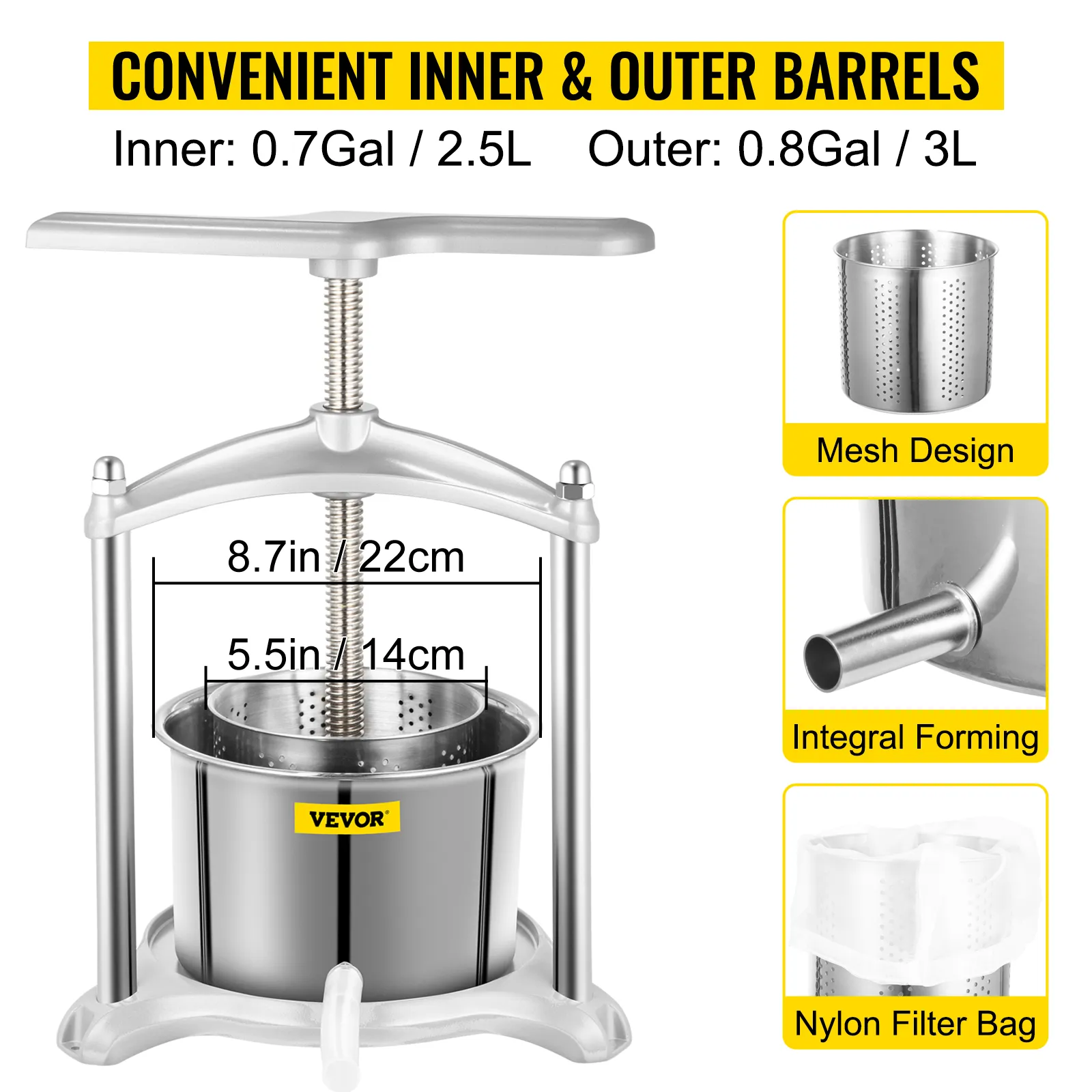 2 barriles aportan muchas comodidades a la extracción de su jugo. El barril interno de 2,5 L (0,7 Gal) está diseñado con orificios de malla, convenientes para la penetración del jugo. El barril exterior de 3 L (0,8 Gal) está en forma integral, hermoso y duradero. También se incluye una bolsa de filtro de nailon en el paquete.