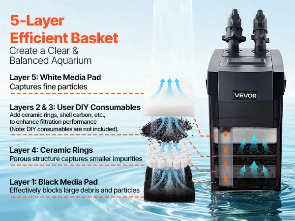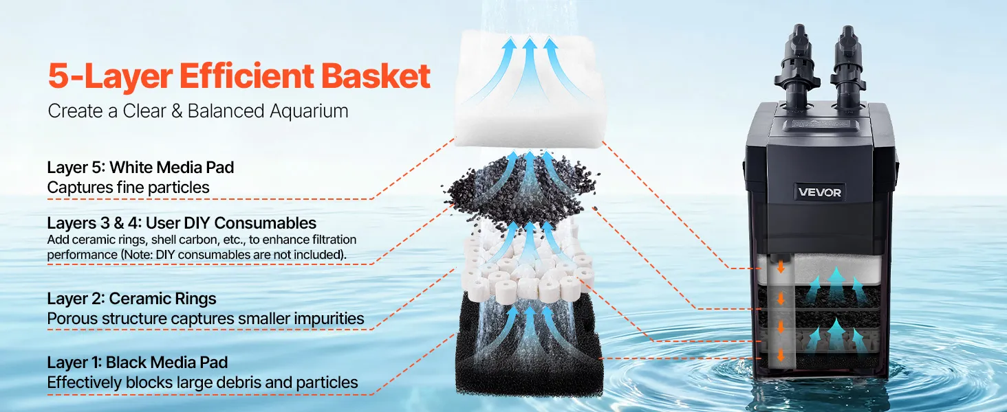 Filtración eficiente: Nuestro filtro externo para acuario cuenta con un medio filtrante de cinco capas. El algodón filtrante negro captura las partículas grandes; los anillos de cerámica porosa capturan las impurezas pequeñas; el algodón blanco filtra las partículas finas. Los consumibles para montaje no están incluidos.