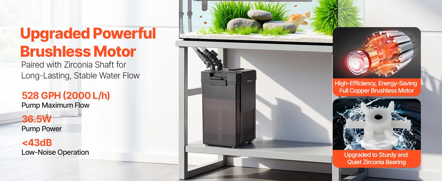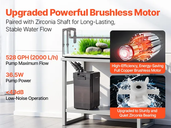 Este filtro para acuario cuenta con un motor sin escobillas de cobre de bajo consumo y un eje de circonio robusto y silencioso, lo que garantiza un flujo de agua fuerte y estable. Su funcionamiento silencioso crea un ambiente tranquilo y limpio para usted y su acuario.