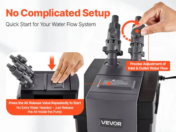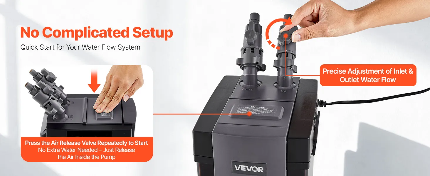 El filtro externo para acuarios permite poner en marcha el sistema de filtración rápidamente con una operación sencilla. No requiere agua adicional; basta con expulsar el aire de la bomba y el sistema de filtración comenzará a funcionar de inmediato para que disfrutes de un cuidado de peces sin complicaciones.