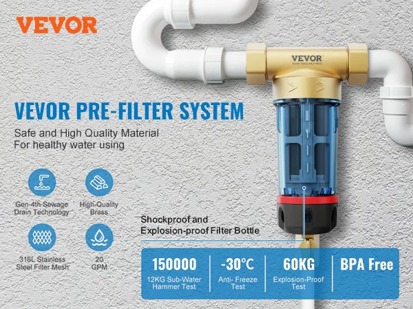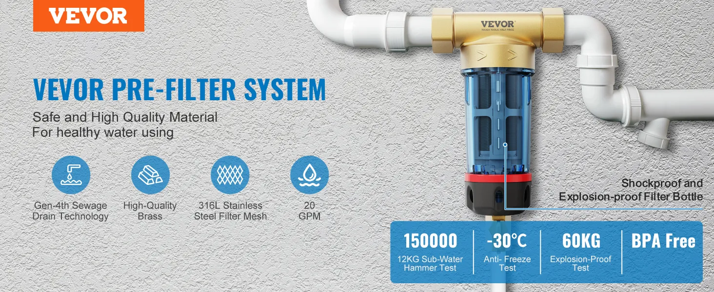 El prefiltro es la primera línea de defensa de los sistemas de agua domésticos, y VEVOR se compromete a mejorar la calidad del agua en la fuente, prolongando la vida útil de los electrodomésticos posteriores.