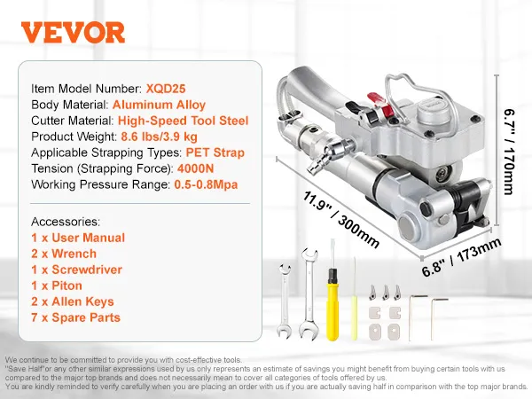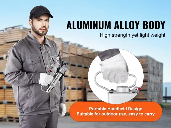 Sturdy Aluminum Alloy Body: Our handheld strapping machine's aluminum alloy body is both lightweight and tough. It's easy to carry around and operate, with excellent corrosion resistance for all kinds of environments. Measuring just 11.9" x 6.8" x 6.7" and weighing 8.6 lbs, it's portable and durable, perfect for long-term outdoor use.