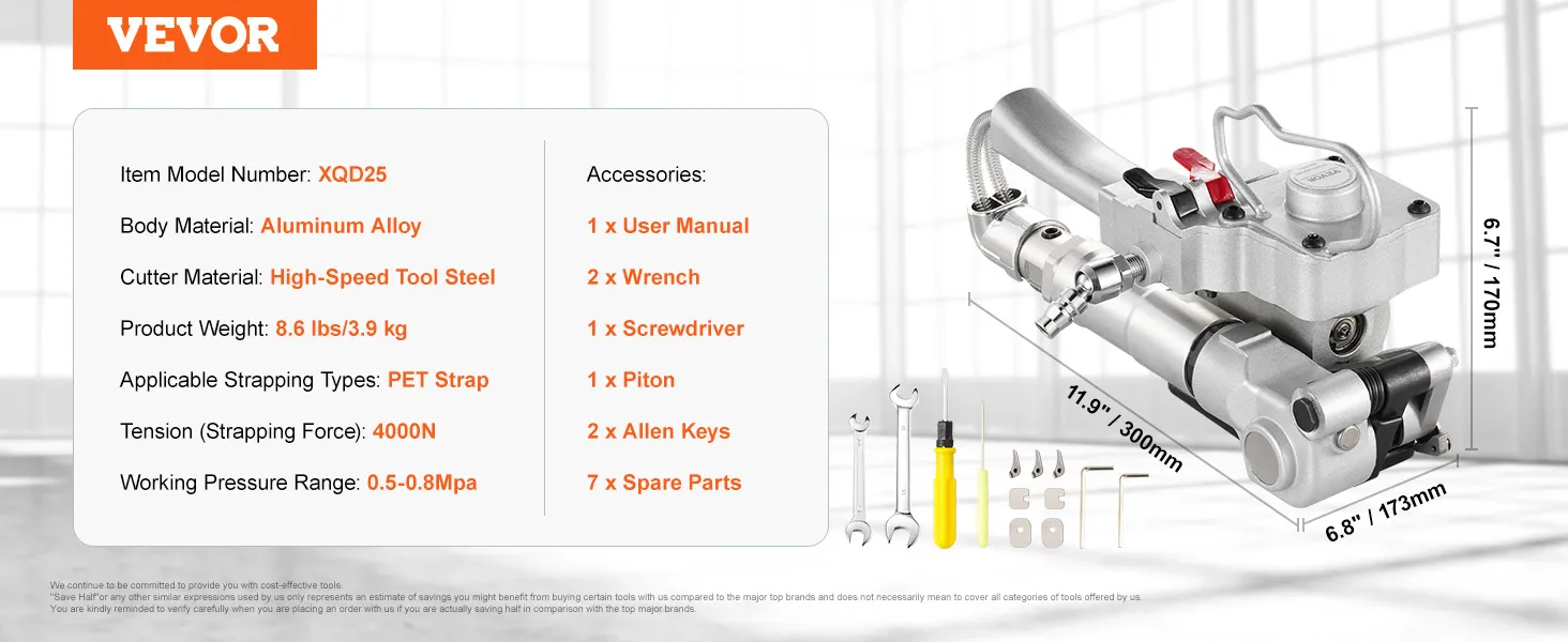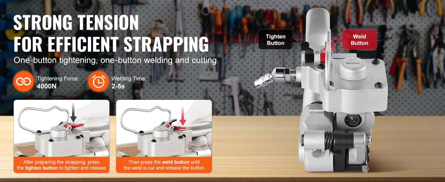 Powerful Performance: Our pneumatic strapping machine packs a punch with a high-power cylinder, delivering 4000N of tension. It works at 0.5-0.8Mpa pressure and has a welding time of just 2-5 seconds. Compatible with 0.75"-1" wide PET straps, it's perfect for securing items of various sizes and weights, ensuring a snug fit for safe transport and storage.