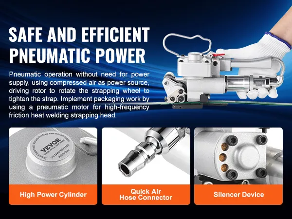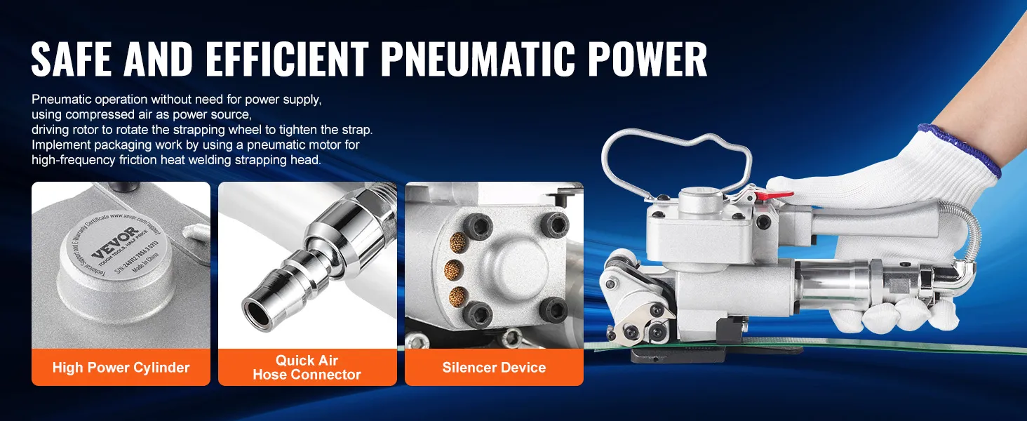 Unlike traditional electric or manual machines, our pneumatic strapping tool operates without a power source, making it ideal for a range of applications. Perfect for industries like paper, aluminum, steel, wood, chemicals, and metal products, it adapts to various packaging needs.