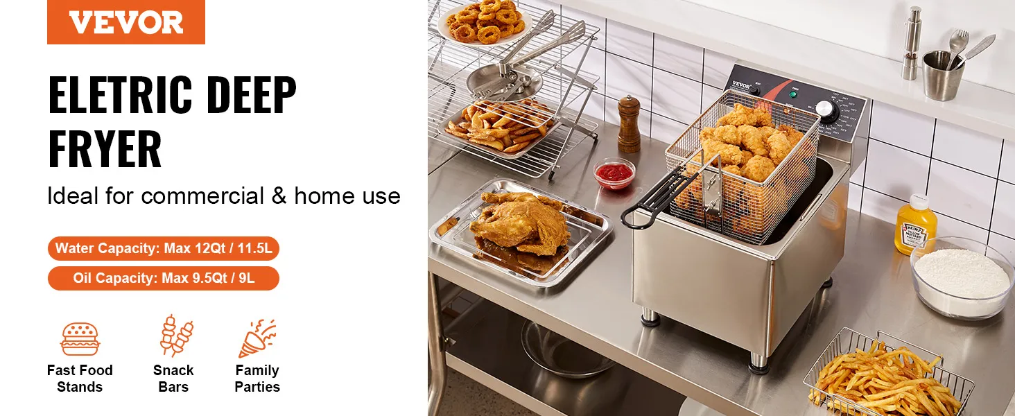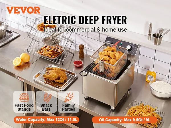 Gran capacidad: al utilizar un tanque de aceite de 9,5 cuartos de galón (capacidad de agua: máx. 12 cuartos de galón (11,5 l)), esta freidora eléctrica comercial le permite freír diversos alimentos y mantener su sabor único. Funciona bien en tiendas de delicatessen, puestos de comida rápida, bares y fiestas.