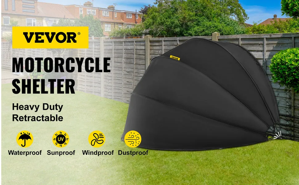 Aquí le ofrecemos esta tienda refugio para motocicletas duradera y retráctil. Hecho de tela Oxford 600D resistente a desgarros, está diseñado para proteger su bicicleta, motocicleta y scooter de la lluvia, la nieve, el polvo y los rayos ultravioleta. Ya no tendrás que preocuparte de que tu motocicleta se ensucie y se desprenda pintura. ¡Consiga uno ahora, pruebe nuestro refugio para motocicletas premium!