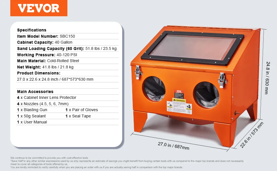 Cabina de arenado VEVOR de 40 galones, cabina de arenado portátil de sobremesa de 40-120 PSI, arenadora de acero resistente con pistola de arenado y 4 boquillas de cerámica para eliminar pintura, manchas y óxido.