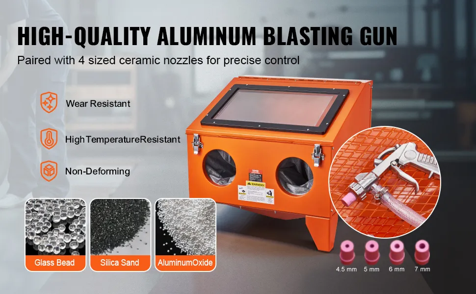 Nuestro kit de arenadora incluye una pistola de chorro de aluminio de alta calidad que ofrece durabilidad y un control preciso. También incluye cuatro boquillas de cerámica de 4,5 mm, 5 mm, 6 mm y 7 mm, que ofrecen una resistencia superior al desgaste, la corrosión y el calor en comparación con las boquillas metálicas.