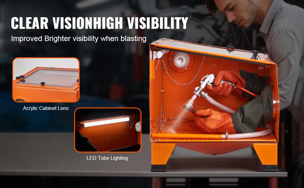 Visibilidad nítida, eficiencia óptima: Con una gran ventana acrílica e iluminación LED brillante, este gabinete para arenadora ofrece una vista amplia y alta visibilidad durante las tareas de arenado. Incluye 4 protectores de lente, lo que elimina la necesidad de comprar accesorios por separado.