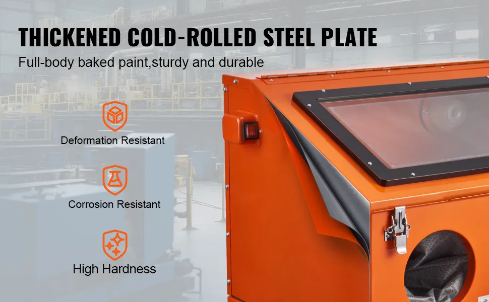 Duradero: Fabricado con acero laminado en frío de alta resistencia, el gabinete de arenado ofrece una alta dureza y una durabilidad excepcional. Su superficie con recubrimiento en polvo mejora la resistencia a la corrosión y al óxido, garantizando así que satisfaga sus necesidades de arenado durante años.