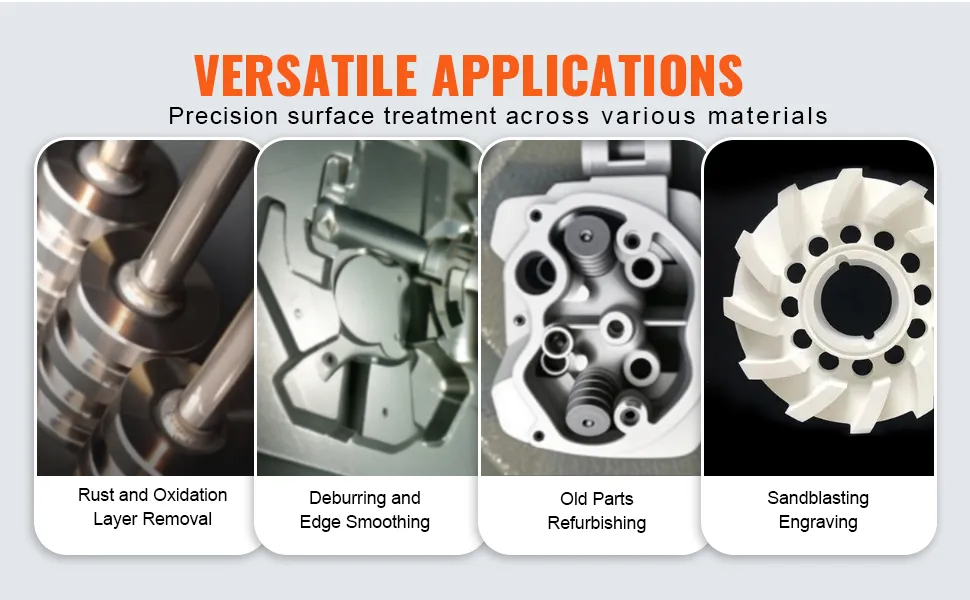 El kit de chorro de arena es versátil para una amplia gama de tratamientos de superficies en diversos materiales. Desde la eliminación de óxido y capas de oxidación hasta el desbarbado, el alisado de bordes, la restauración de piezas antiguas y el grabado con chorro de arena, satisface diversas necesidades con precisión y facilidad.