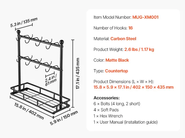 VEVOR - Soporte para tazas de café de encimera, 16 ganchos con base de almacenamiento, soporte para tazas de 2 niveles de acero al carbono, para exhibir y almacenar en la barra de café del hogar (negro mate)