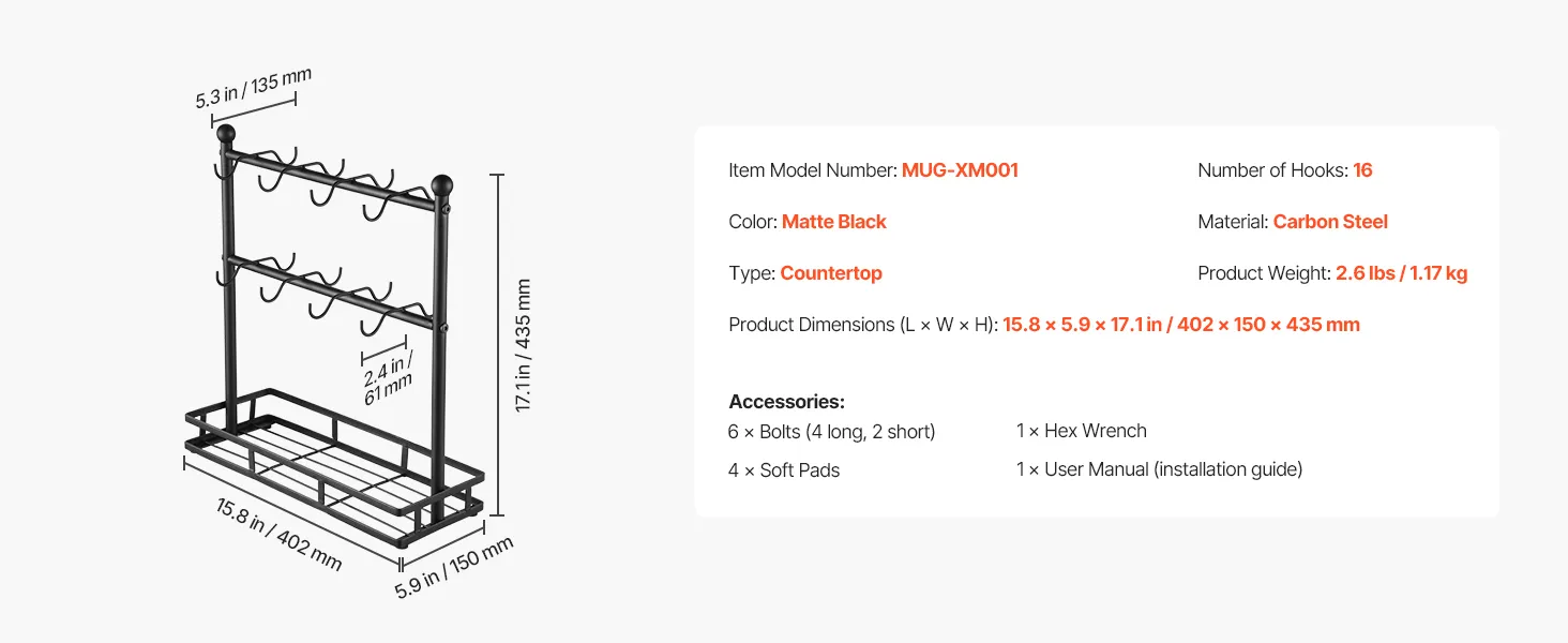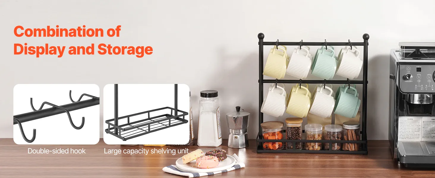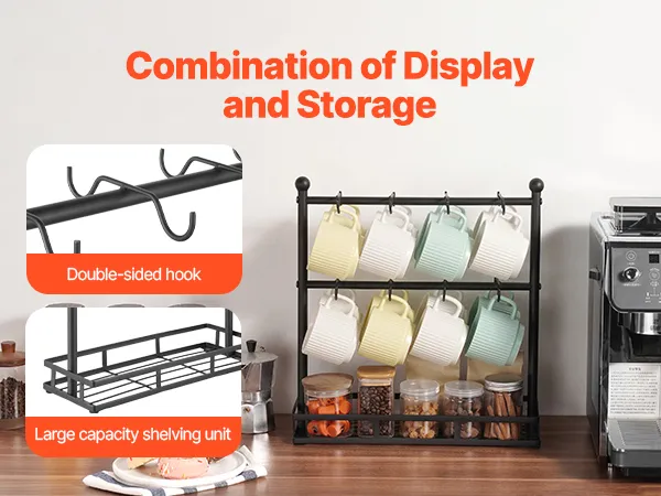 El soporte para tazas de café cuenta con ganchos de doble cara que pueden sostener hasta 16 tazas de café. La base de almacenamiento de gran capacidad es perfecta para guardar artículos adicionales y ofrece una excelente capacidad de almacenamiento.