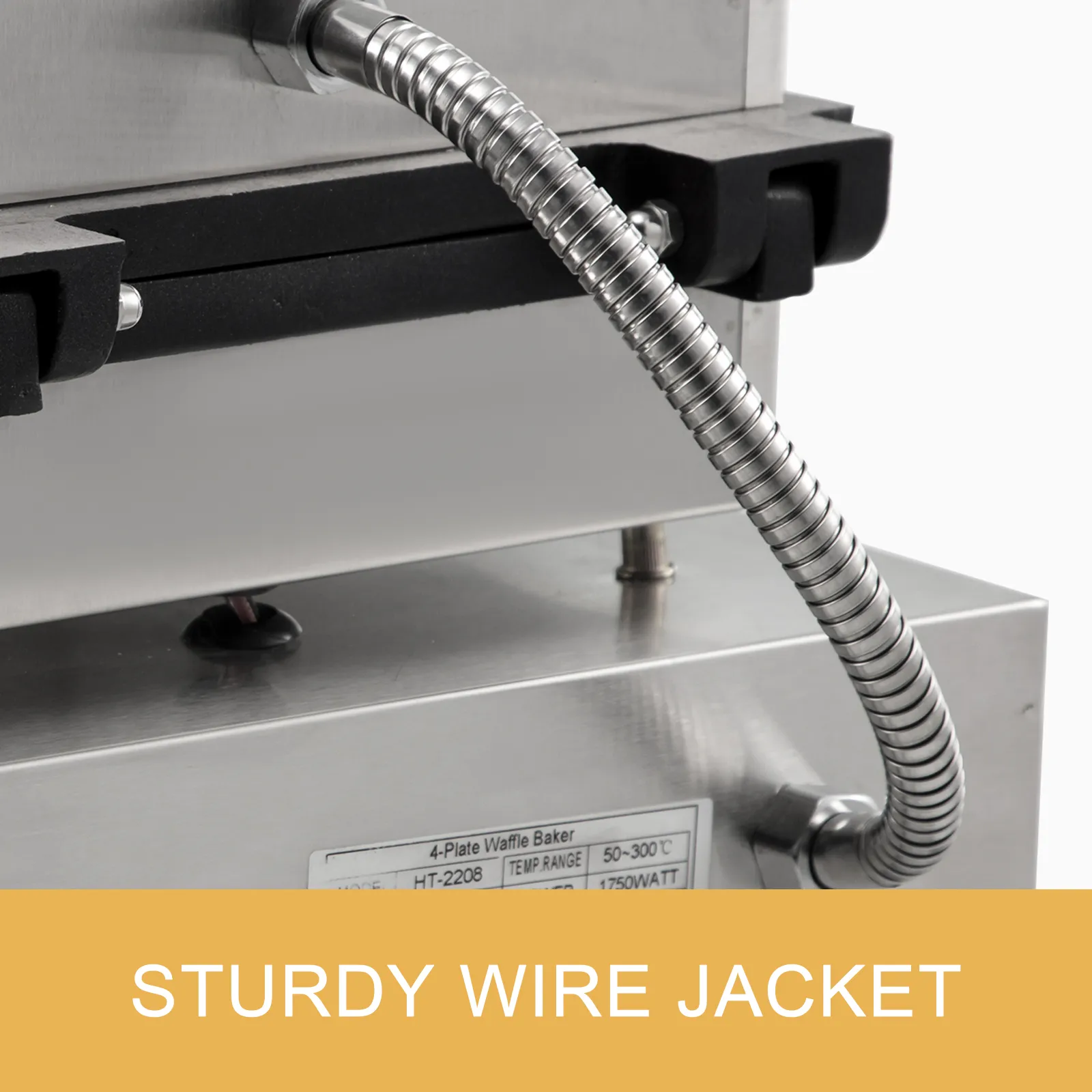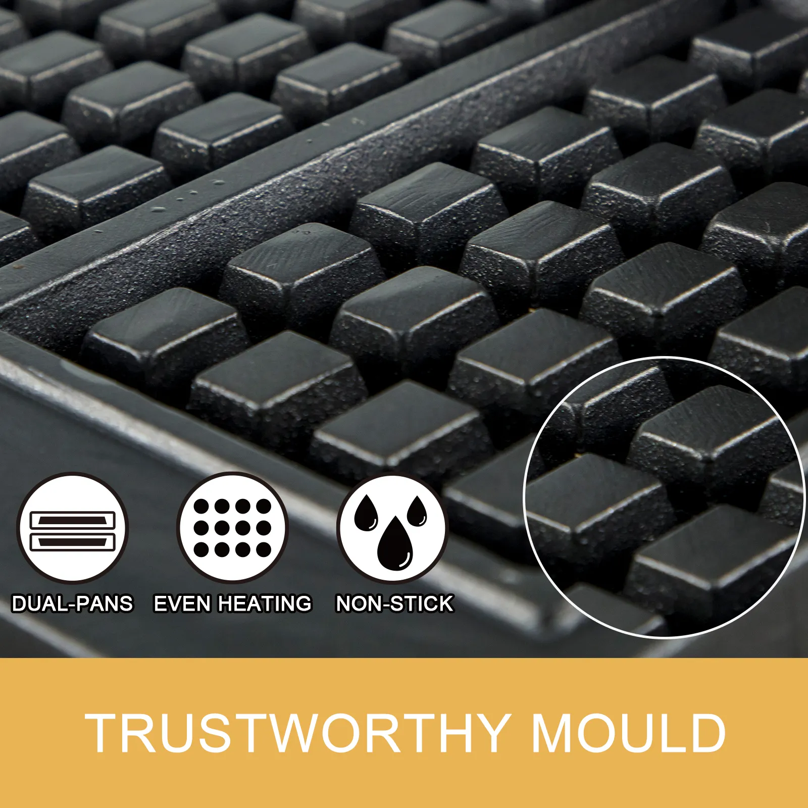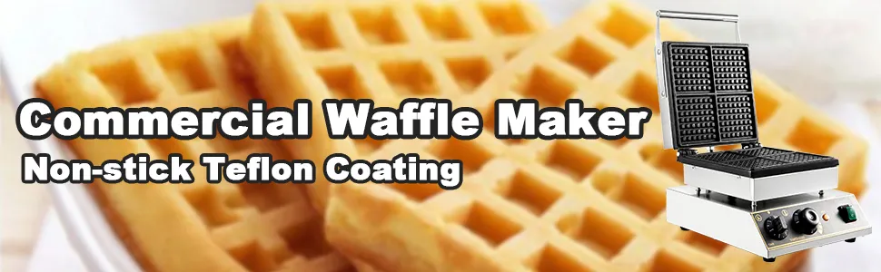 La máquina para hacer gofres adopta bandejas dobles (superior e inferior) (4 gofres a la vez). El molde tiene un tamaño de 6.1"x6.1"(155x155mm), profundidad de 0.3"(8mm). Superficie recubierta de teflón para cocinar antiadherente y mantiene su lugar ordenado.