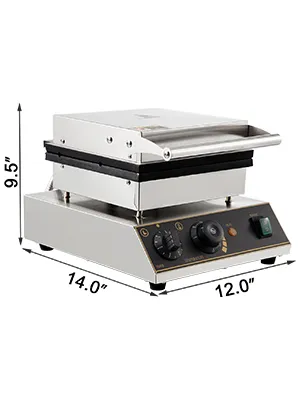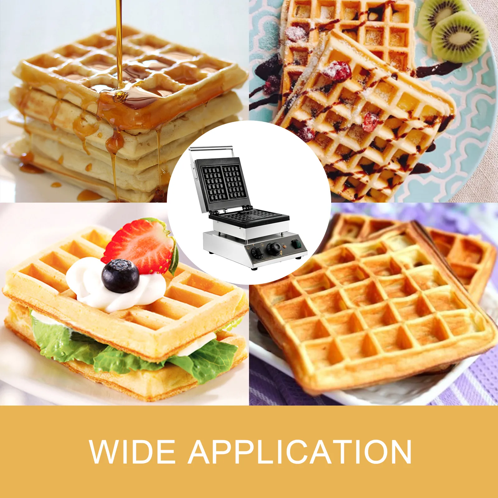 Máquina para hacer gofres cuadrados , diseñada para hornear deliciosos gofres . _ Hecha de acero inoxidable de calidad, la máquina es hermosa, duradera y fácil de limpiar. El molde de aluminio fundido con revestimiento de teflón hace que cocinar sea fácil y rápido. Tiempo y temperatura precisos. control. Alarma proporcionada cuando el proceso de cocción ha terminado.
