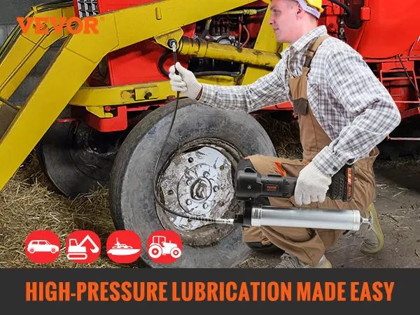 Listo para todo: Este kit de pistola de engrase inalámbrica es fácil de usar. No solo es para maquinaria: es perfecto para coches, barcos, maquinaria agrícola y maquinaria de construcción. Desde fábricas hasta campos, muelles y talleres, está listo para usar donde lo necesite.