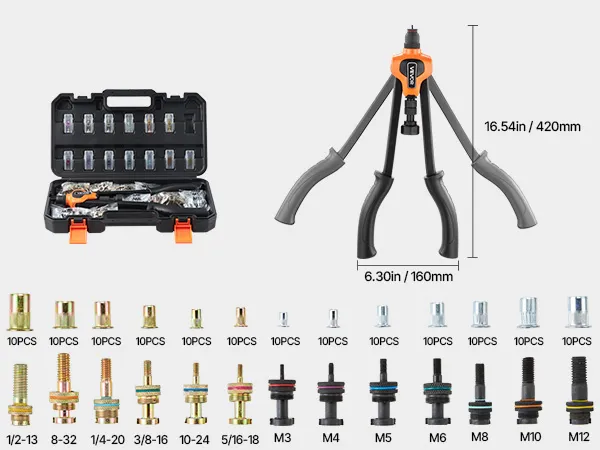 Un kit se adapta a más trabajos: Nuestro kit de herramientas para tuercas remachadoras incluye 13 mandriles intercambiables (métricos: M3, M4, M5, M6, M8, M10, M12; SAE: 10-24, 5/16-18, 3/8-16, 1/4-20, 8-32, 1/2-13UNC), 130 tuercas (10 piezas de cada tamaño) y un estuche de transporte resistente para un fácil almacenamiento