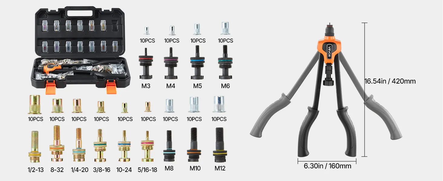 Kit de herramientas para tuercas remachables VEVOR de 17 pulgadas, con 13 mandriles y 130 tuercas, medidas métricas y SAE: M3, M4, M5, M6, M8, M10, M12, 1/2-13, 8-32, 10-24, 1/4-20, 5/16-18, 3/8-16 UNC, y estuche de transporte.