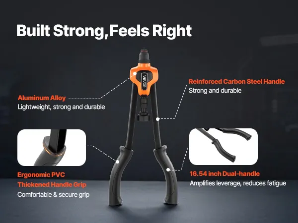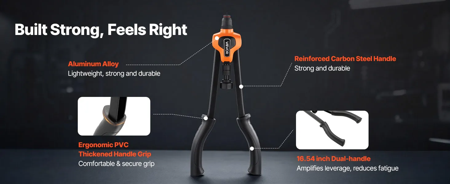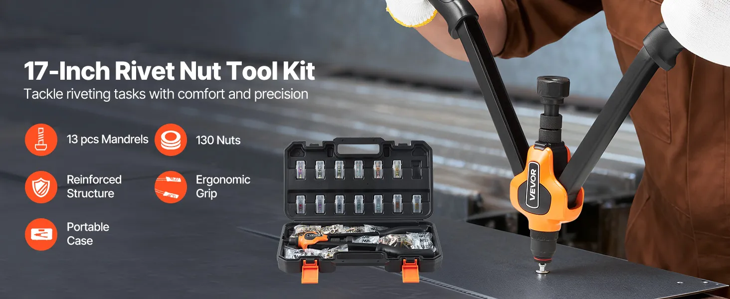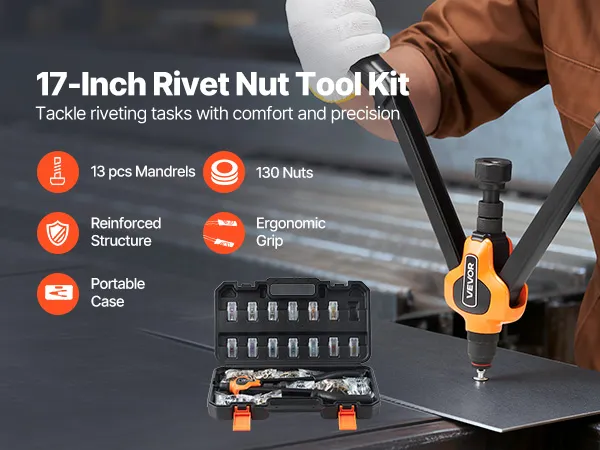 Diseñado para la potencia, la comodidad: El kit de herramientas para tuercas remachables de 17 pulgadas aumenta el apalancamiento, mientras que el mandril de 35CrMo aporta resistencia a largo plazo. Las empuñaduras de PVC engrosadas ofrecen un agarre suave y antideslizante que se mantiene cómodo y firme durante largas sesiones.