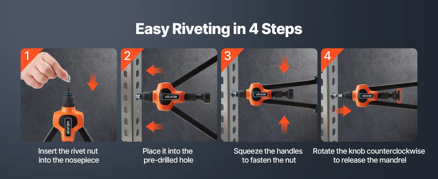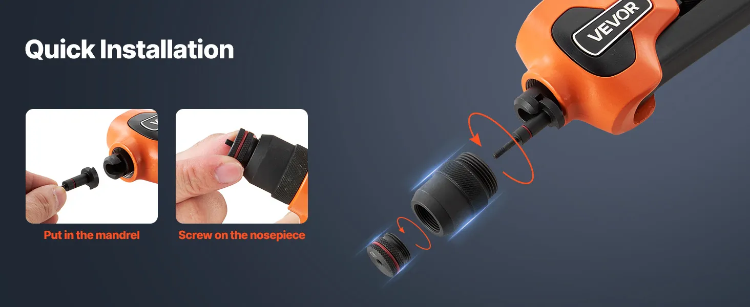 Fácil de usar: Presione 2 o 3 veces para apretar y gire para expulsar: suave y eficiente en todo momento. Diseñada tanto para profesionales como para aficionados, esta herramienta para tuercas remachables garantiza una fijación fiable y un manejo sencillo.