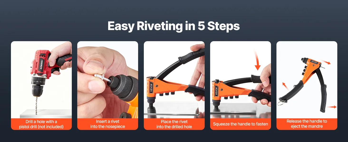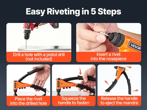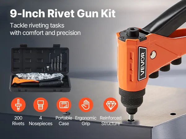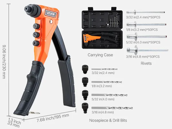Kit de remachadora manual VEVOR con 200 remaches ciegos, remachadora manual resistente de una sola mano con 4 boquillas intercambiables, 4 brocas y estuche de transporte, herramienta manual para metal, automoción y hogar.