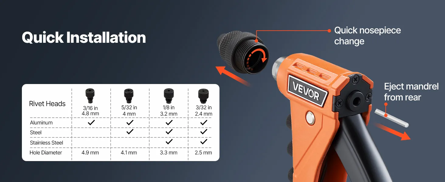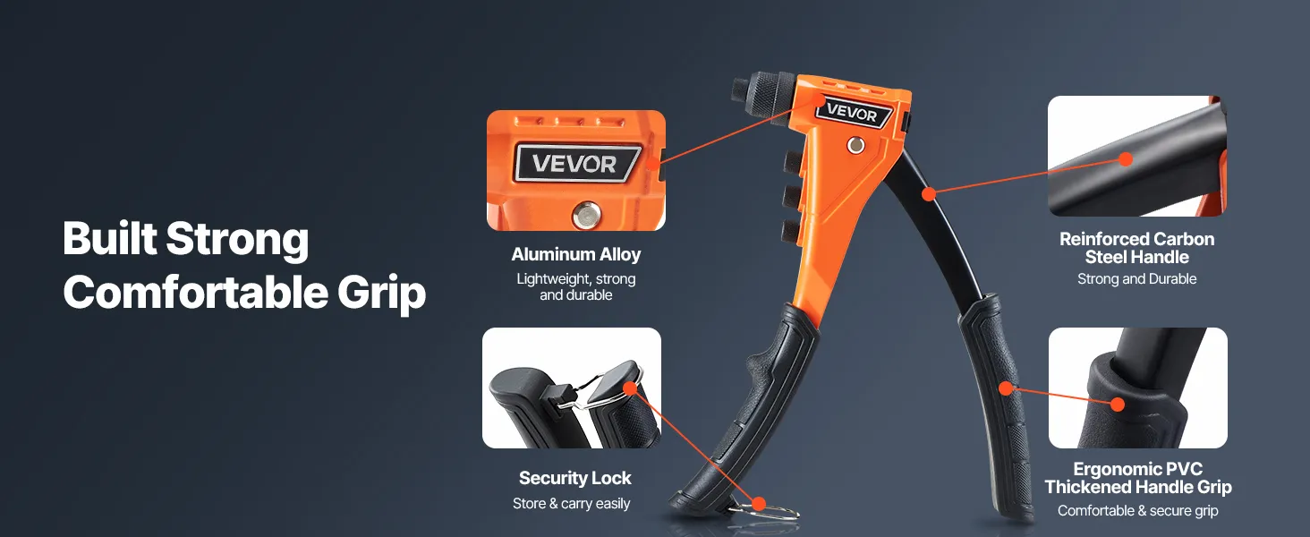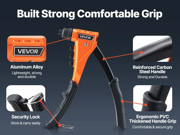 Duradera y con agarre cómodo: Fabricada con aleación de aluminio fundido a presión y acero tratado térmicamente, esta remachadora está diseñada para un uso prolongado. El mango ergonómico aumenta el apalancamiento y reduce el esfuerzo, mientras que la empuñadura de PVC engrosada proporciona comodidad y control.